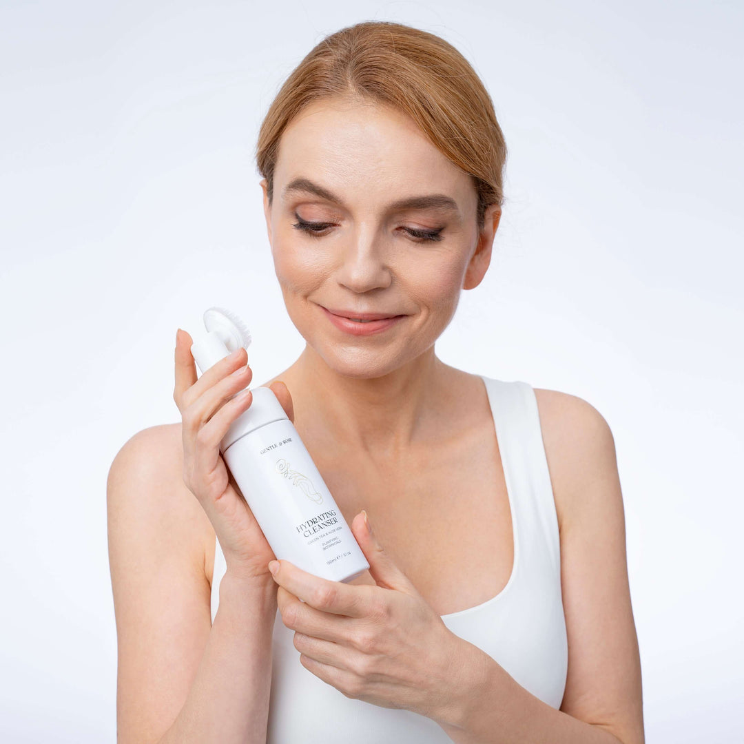 За разлика от обикновените почистващи продукти, нашата формула почиства в дълбочина, без да премахва естествените масла, благодарение на подхранващите съставки и нежното ексфолиране, осигурено от четка от медицински силикон.